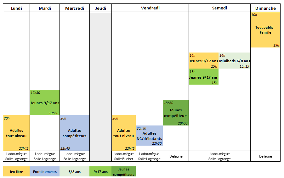 Vous trouverez ci-dessous le planning capitulant les horaires et les lieux de nos différente séances de badminton.